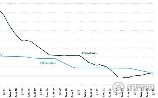 以太坊于2025年7月30日迎来10岁生日。以太坊的初始通胀率远高于比特币,分别为14.4%和9.3%。然而,以太坊随后进行了两项重大的经济政策调整,使其通胀率低于比特币。