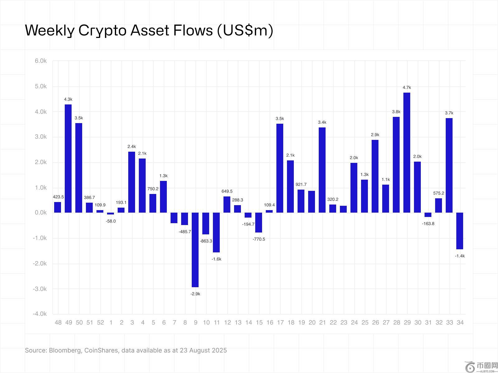 数字资产投资产品数周来首次出现大幅资金流出,总额达14.3亿美元,为3月以来最大单日流出量。本周初,围绕美联储立场的悲观情绪导致20亿美元资金流出。然而,在杰罗姆·鲍威尔于杰克逊霍尔研讨会上发表讲话后,市场情绪有所转变,其讲话被广泛解读为比预期更为鸽派,并引发5.94亿美元的资金流入。
