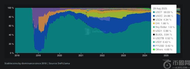 这一数字已上升至目前约 30%。DAI 的占比曾约为 3.5%,现已降至 1.85%。这些调整表明,资金正在稳定币之间转移,而非流出该领域。