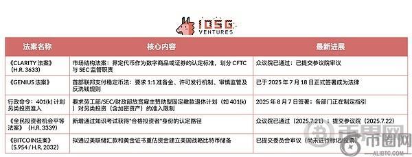 对投资者而言,当前需重点关注以下进展:《GENIUS 法案》已正式生效,为支付型稳定币确立了基础监管框架;众议院通过的《CLARITY 法案》将明确界定代币由美国商品期货交易委员会(CFTC)或证券交易委员会(SEC)管辖的标准;行政命令正推动监管机构开放 401(k) 计划对加密资产的投资渠道;而众议院通过的合格投资者考试改革方案,有望扩大私募加密交易参与者的准入范围。