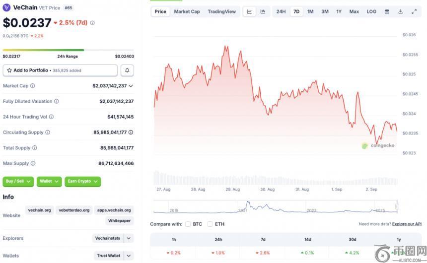 根据CoinCodex 的价格分析:VeChain(VET)将在 9 月中旬遭遇下跌至 0.0229 美元的价位。跌至 0.022 美元将导致 VET 价格从当前价位回调约 3.3%。尽管可能出现下跌,但 CoinCodex 分析师预计 VET 价格将在本月底回升,于 9 月 30 日达到 0.0250 美元。如果从当前价位涨至 0.0250 美元,将使 VET 价格上涨约 5.49%。