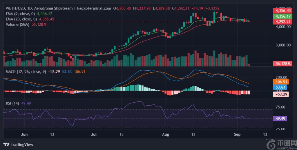 以太坊(以太坊) 是 导航日线图上出现了一段犹豫不决的时期,价格走势在 4,300 美元的低位徘徊,而技术信号显示市场陷入看涨尝试和看跌压力之间。