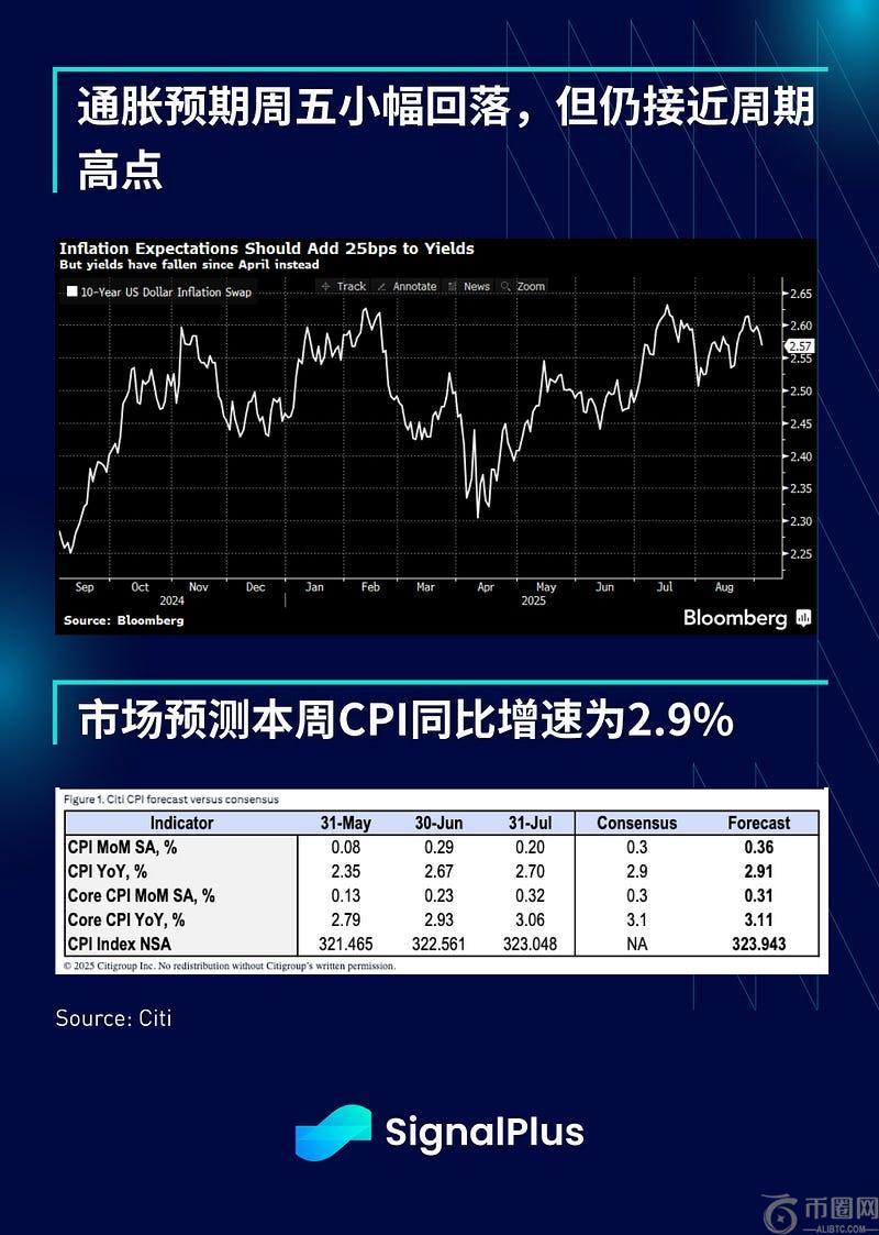 通胀预期保持稳定,投资者重新评估经济放缓的可能性,通胀互换和长期债券盈亏平衡通胀率均有所下降,市场预测本周CPI数据为2.92%。未来数月的数据将成为关键,以确认潜在通胀放缓的信号,并揭示关税相关价格压力的初步迹象。任何偏鹰派的高位通胀数据可能对风险资产造成不利影响。