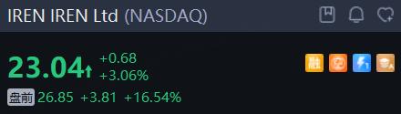 IREN 涨超16%,第四财季调整后EBITDA超预期,年度比特币挖矿收入有望突破10亿美元。