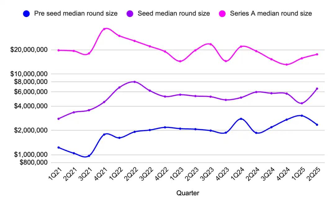 · 种子轮金额上升。种子轮融资中位数跃升至 660 万美元,扭转了第一季度的下降趋势,表明资本对早期阶段的信心增强。