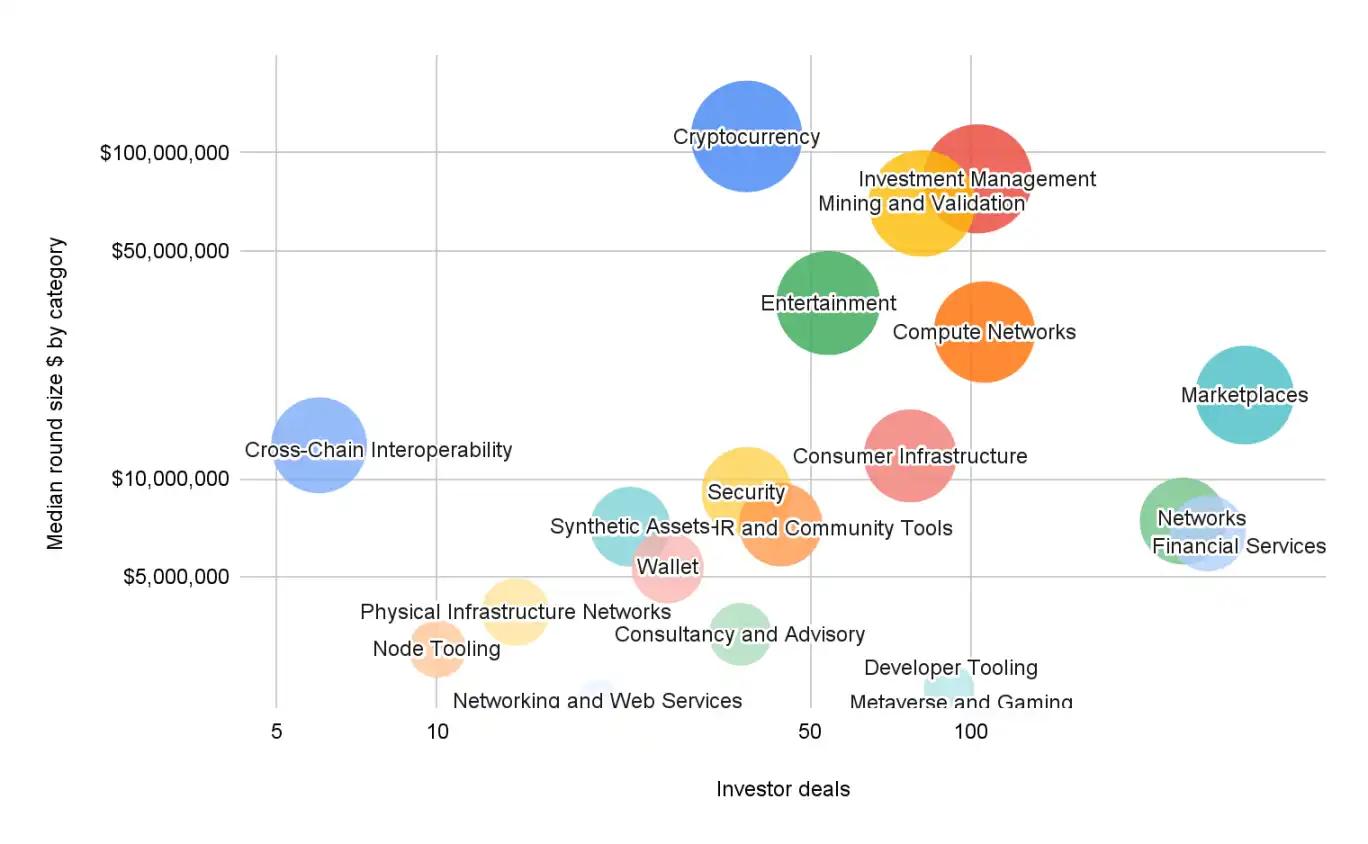 最大的融资规模发生在基础设施(中位数 1.12 亿美元)、挖矿与验证(中位数 8300 万美元)和计算网络(中位数 7000 万美元)领域。这些不是投机性代币,而是支撑验证者网络、模块化区块空间和 AI 对齐共识系统的基础设施,这类基础层定义了长期的区块链投资策略。投资者的逻辑很明确:支持底层设施,然后快速发展应用层。