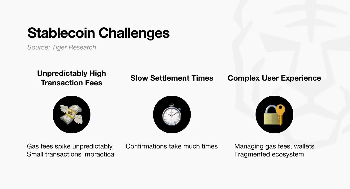 · 难以预测的高额交易费用:稳定币运行在多个区块链网络上,但当网络拥堵时,gas 费用会急剧飙升,使得小额交易变得不可行。在某些情况下,转账 10 美元可能需要支付 20 美元的费用。这直接削弱了稳定币作为日常支付工具的核心价值。