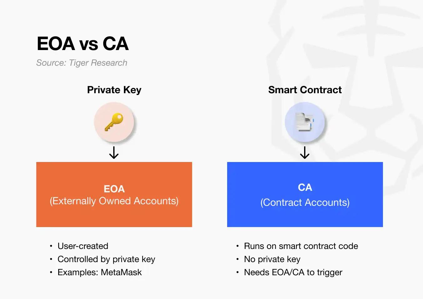 · 合约账户(CA):智能合约账户,能执行复杂逻辑,但不能主动发起交易。
