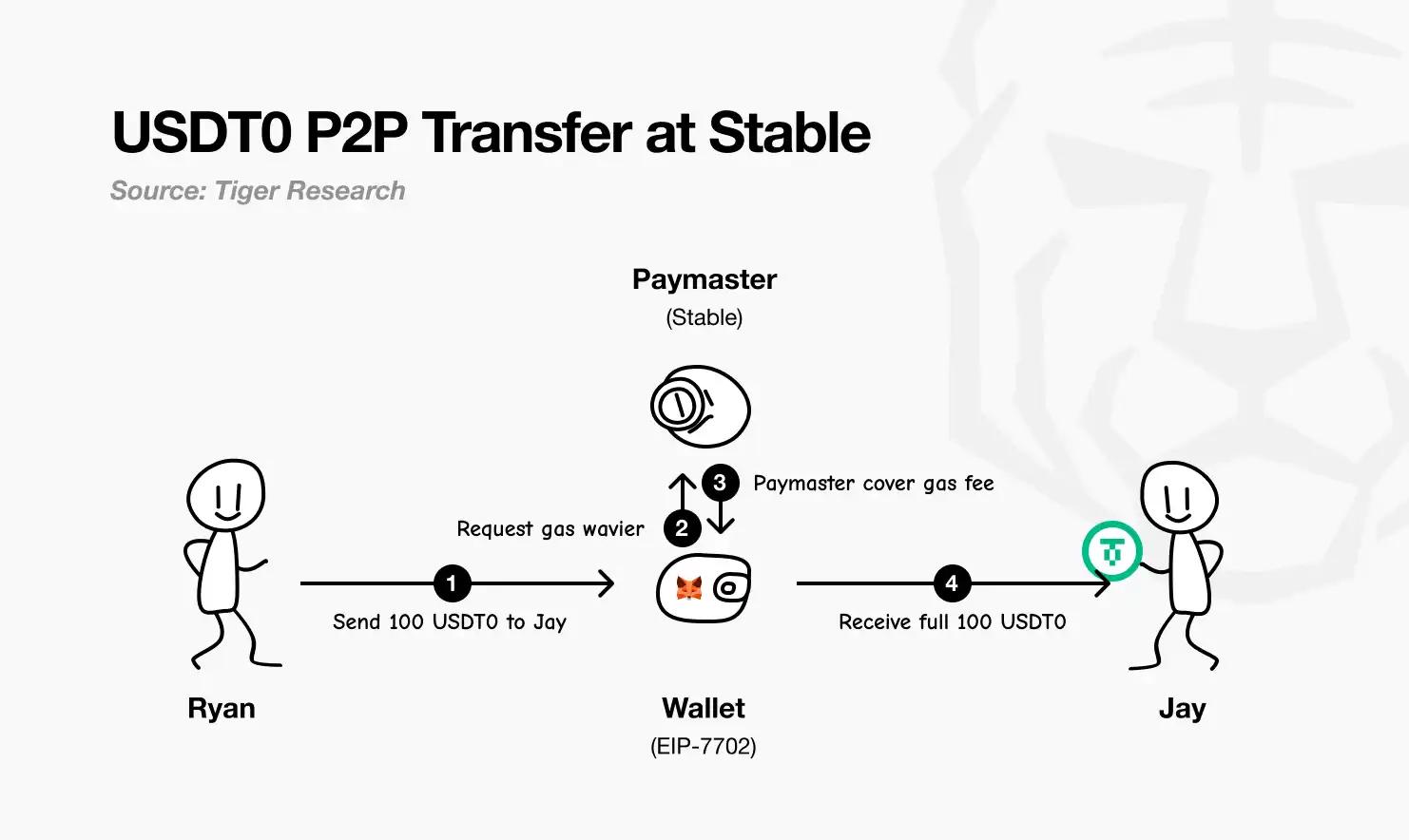 为了实现点对点转账无需 Gas,Stable 采用了 EIP-7702 和账户抽象(Account Abstraction)。这样一来,用户只需持有 USDT0 就能完成所有交易。
