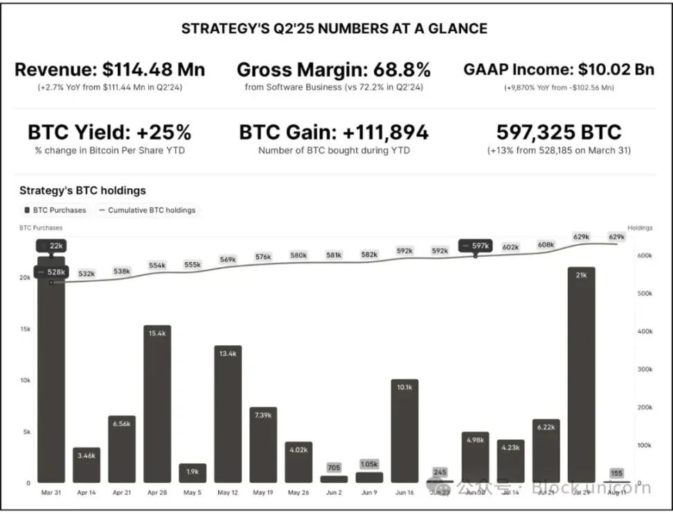 Strategy 的比特币金库策略带来了 100 亿美元的净收入(相比 2024 年第二季度 1.026 亿美元的亏损),这完全是由新会计准则下的 140 亿美元未实现比特币收益推动的。