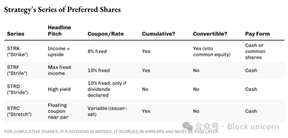 优先股系列:该策略创新了多种永久优先股,以便在任何市场环境下持续筹集资金用于购买比特币,同时限制普通股的稀释。不同的系列提供不同的收益率和期限,使其融资成本与投资者当时的偏好相匹配。