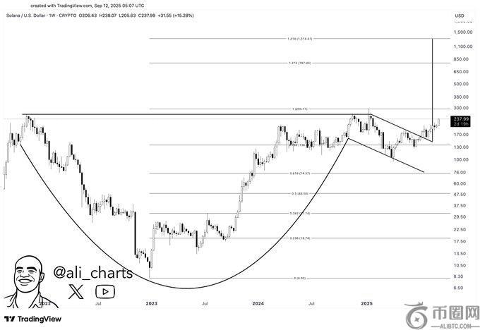知名图表分析师 Ali Chart凸显看涨“杯柄”形态的形成,历史上该形态预示着强劲突破。如果势头持续,一些预测显示,SOL 可能攀升至 1,300 美元,比目前水平高出 5 倍以上。