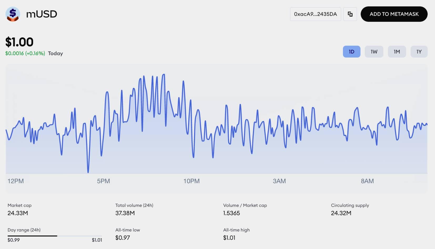 当前 Mask 官网已提供 mUSD 的购买和兑换界面,距离 mUSD 上线不到 24 小时,据 Etherscan 数据 ,截止发文,mUSD 当前的流通供应量为 2436 万枚,其中持币者 179 人,交易 1539 笔。