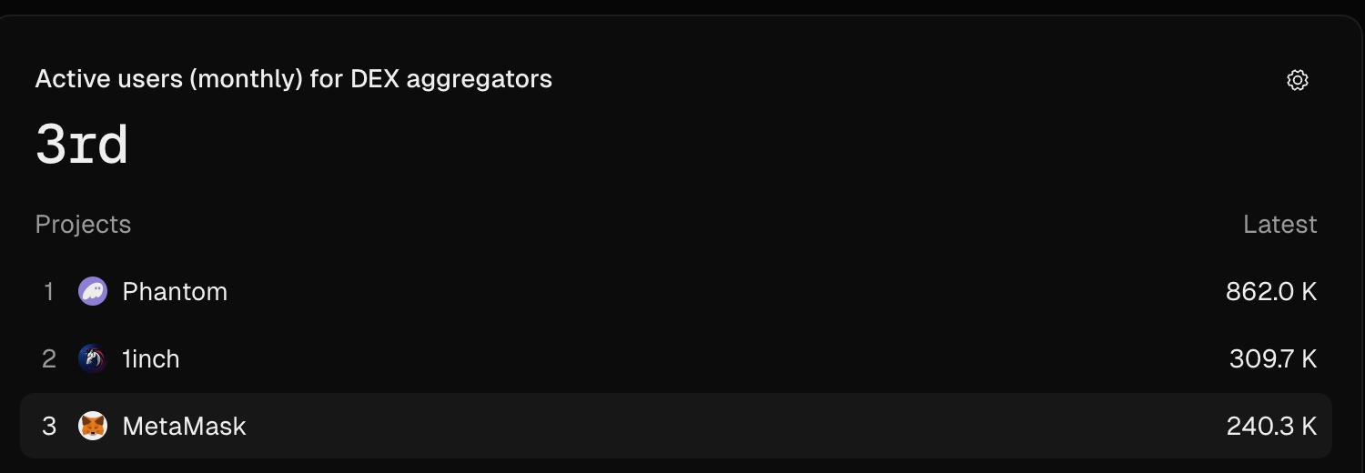 Mask 曾是钱包赛道当之无愧的霸主,在 2021 年牛市和 2024 年 1 月的高峰期创下了 3000 万月活用户的辉煌记录。然而,根据 Token Terminal 数据 ,近几个月其月活用户均在 25 万左右,市占率降至 14.8%,在同类产品中滑落至第三位。