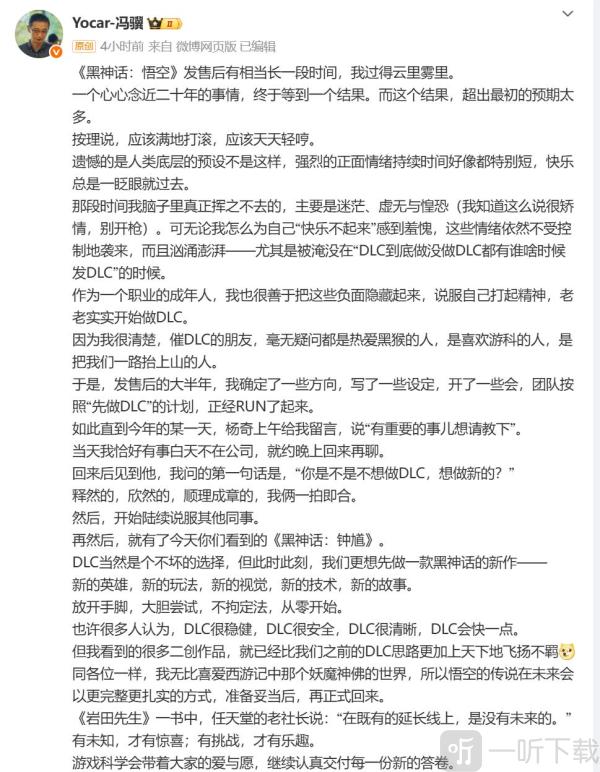 8月20日凌晨,游戏科学创始人、CEO,《黑神话:悟空》制作人冯骥发文解释为何推出新作。他表示,《黑神话:悟空》发售后有相当长一段时间,他过得云里雾里。DLC当然是个不坏的选择,但此时此刻,他们更想先做一款黑神话的新作——新的英雄,新的玩法,新的视觉,新的技术,新的故事。他补充说,“悟空的传说在未来会以更完整更扎实的方式,准备妥当后,再正式回来。”