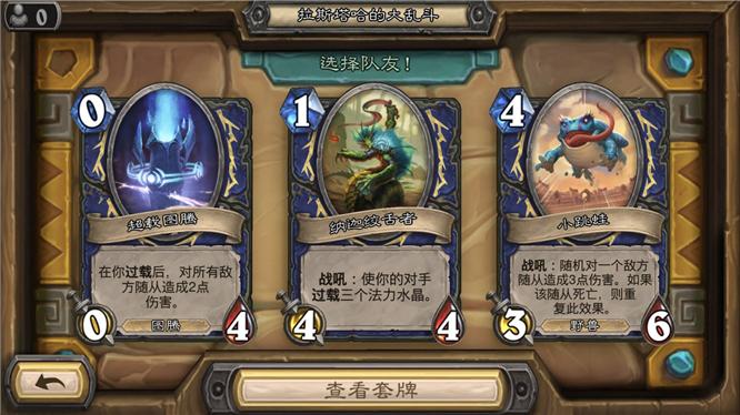 第二个boss是高阶祭司耶克里克,技能是古尔丹的生命分流,他的神龛效果是法术消耗生命而非法力值。前两关的boss实在简单,我就不多阐述了。在打完两个小boss后,会选择一个队友,如图所示,超载图腾、娜迦绞舌者、小跳蛙。我选择了小跳蛙作为新的队友。