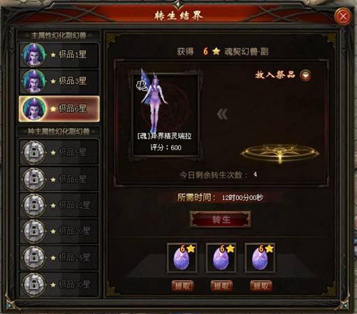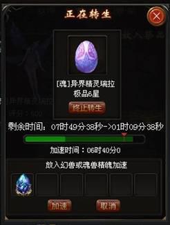 放入的祭品星级越高,转生所需的时间越短,在转生期间,持续放入幻兽或魂兽精魄还可减少转生所需时间。在转生过程中,可随时终止,但已消耗的祭品无法退还。