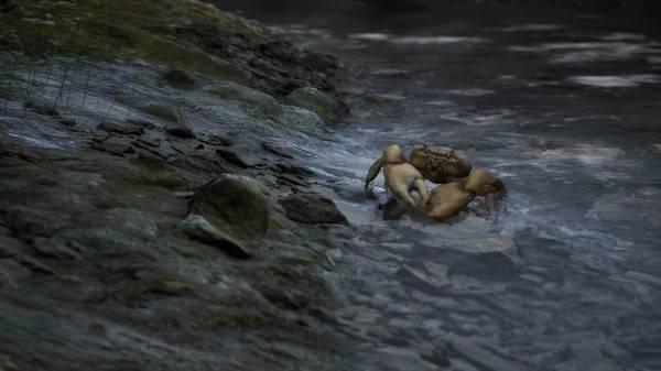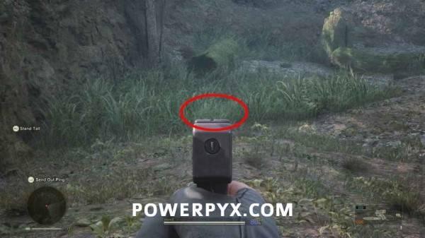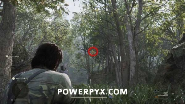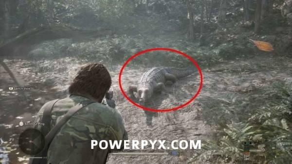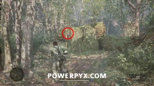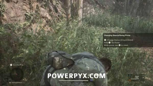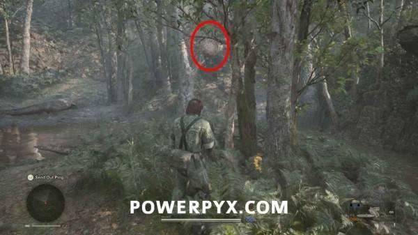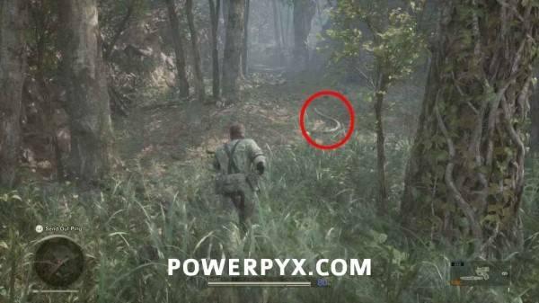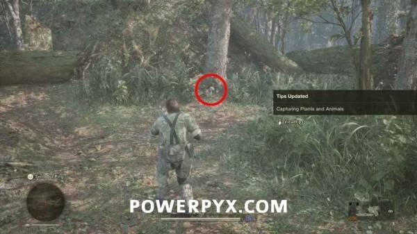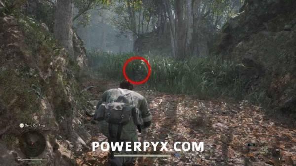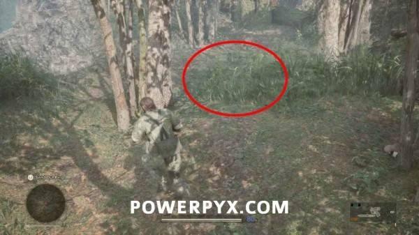 拿到背包后返回起始位置,在之前爬行过的原木附近的草丛里可以看到有青蛙在跳,在非常容易难度下可以使用红外夜视镜来快速定位(按住方向键-左后按L3标记)。因为颜色相近比较难找,建议趴在草丛附近留意草叶的晃动。
