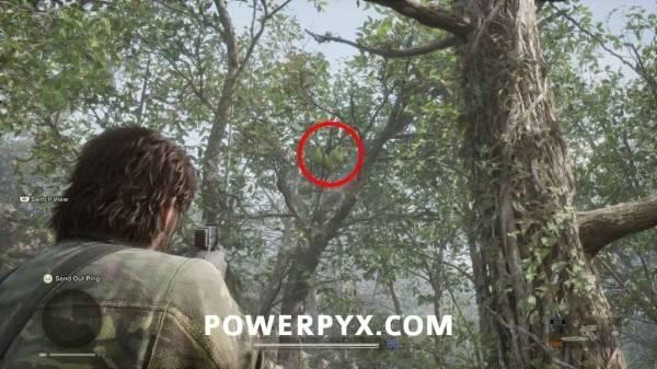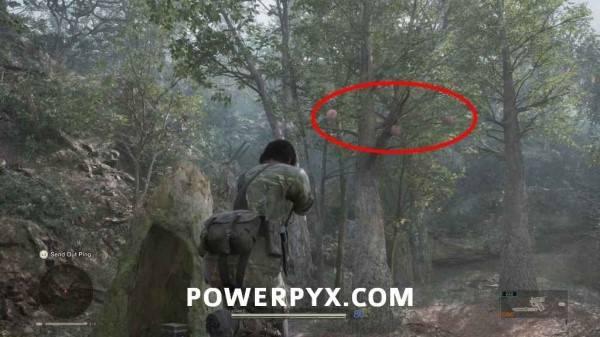 进入此区域后,往第一个巡逻的守卫右侧的树上看,就挂在高处树枝上,像黄绿色的梨。