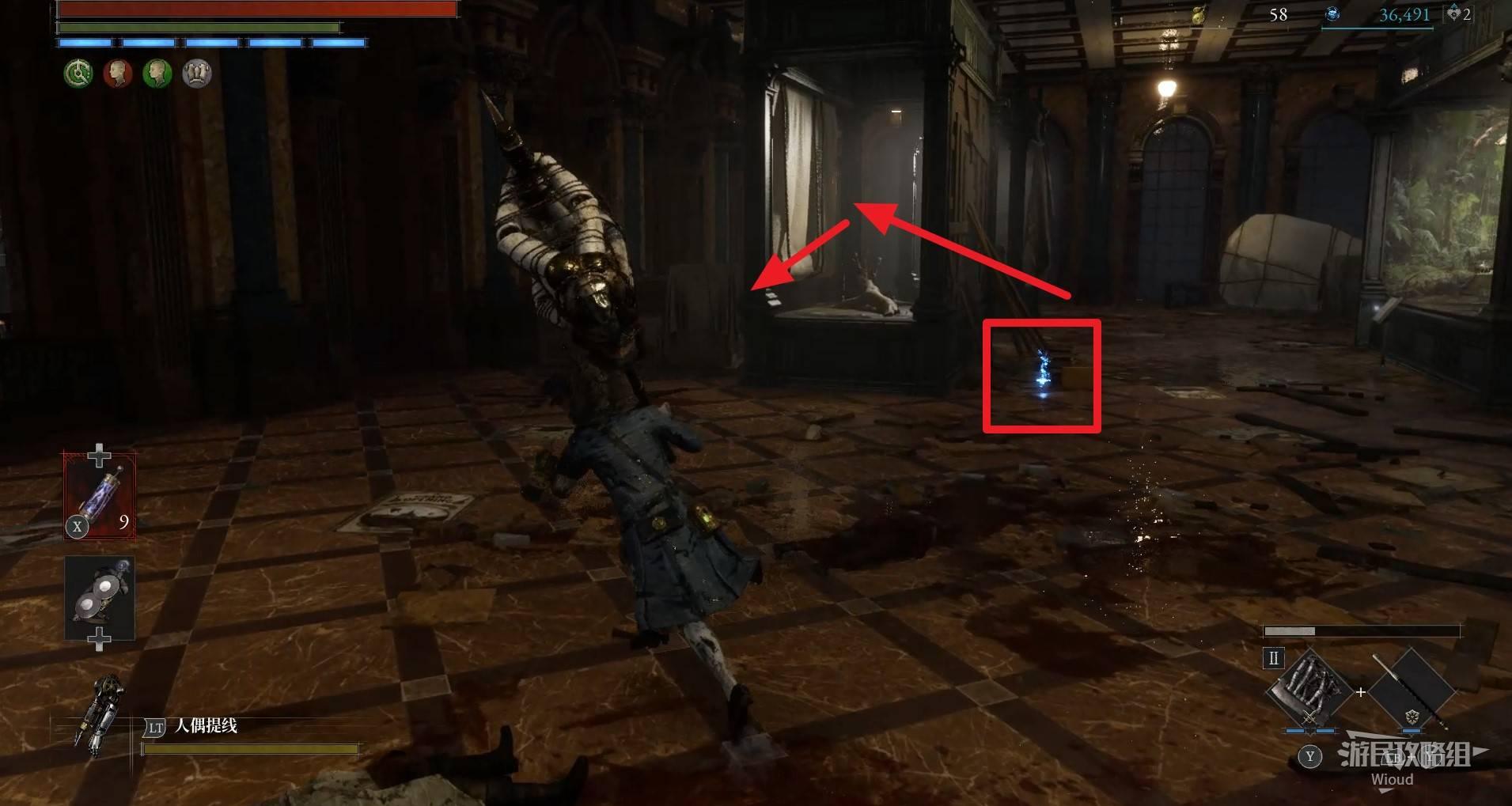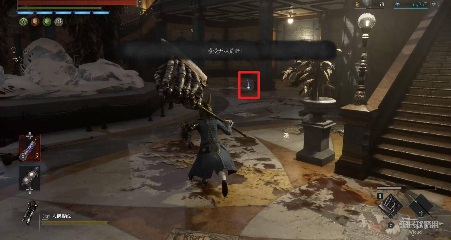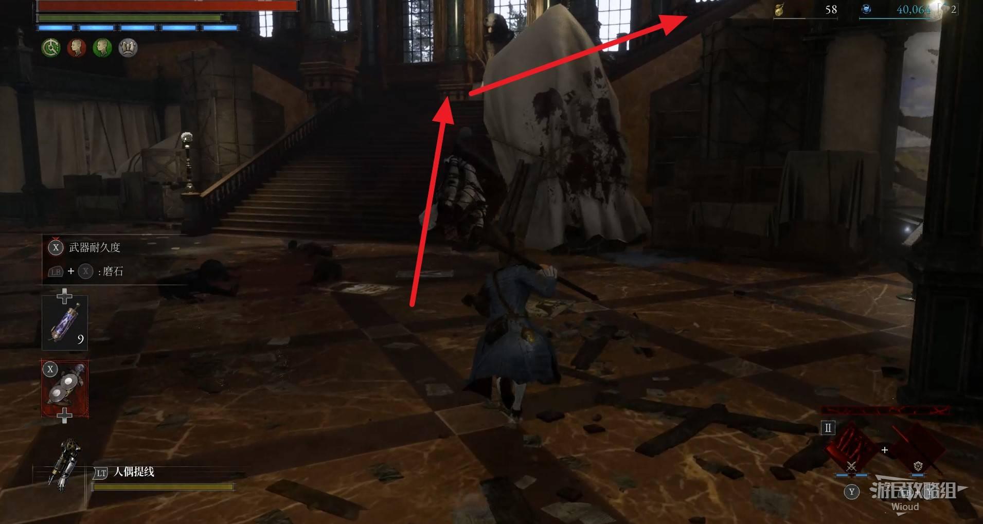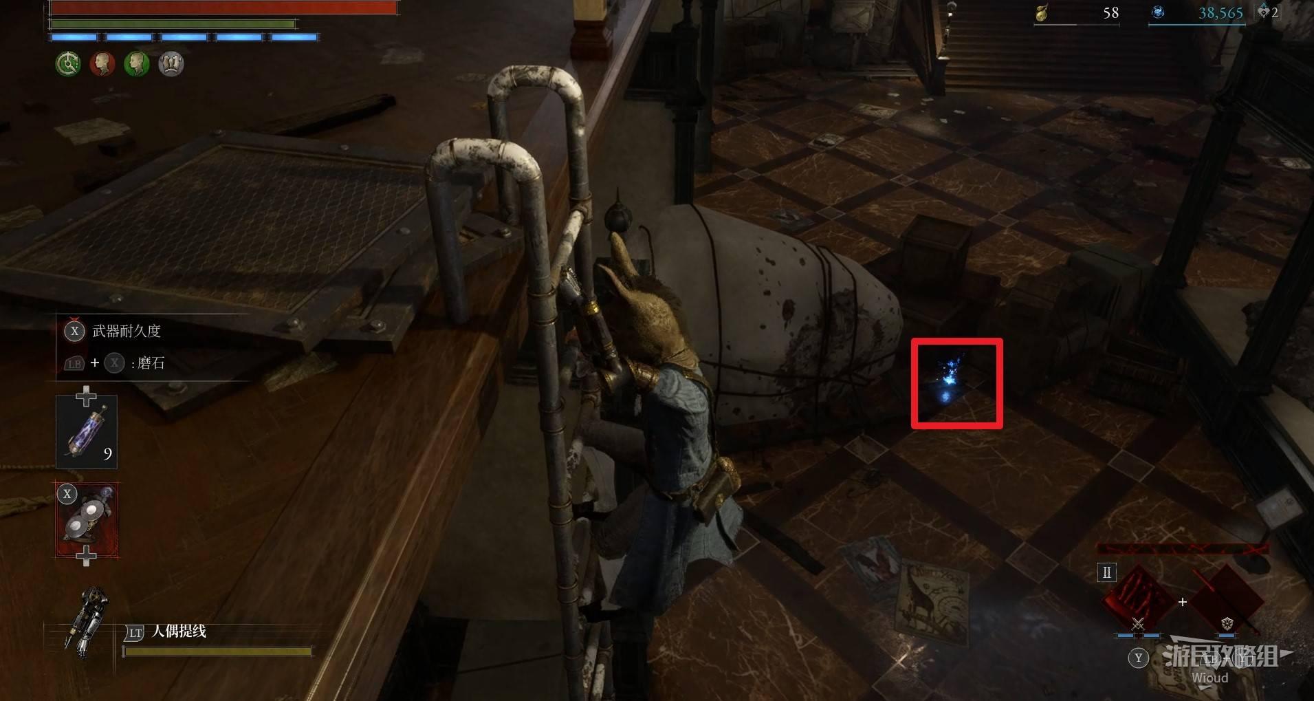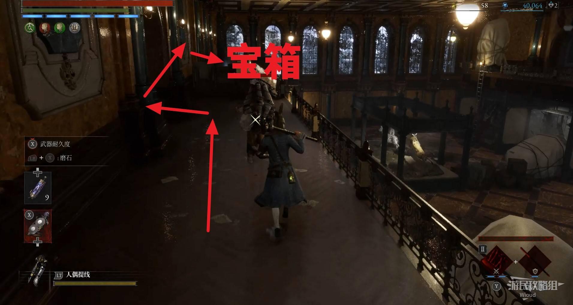 篝火右侧的箱子处可捡到【铅球】,大厅中间左侧的楼梯是断掉的。