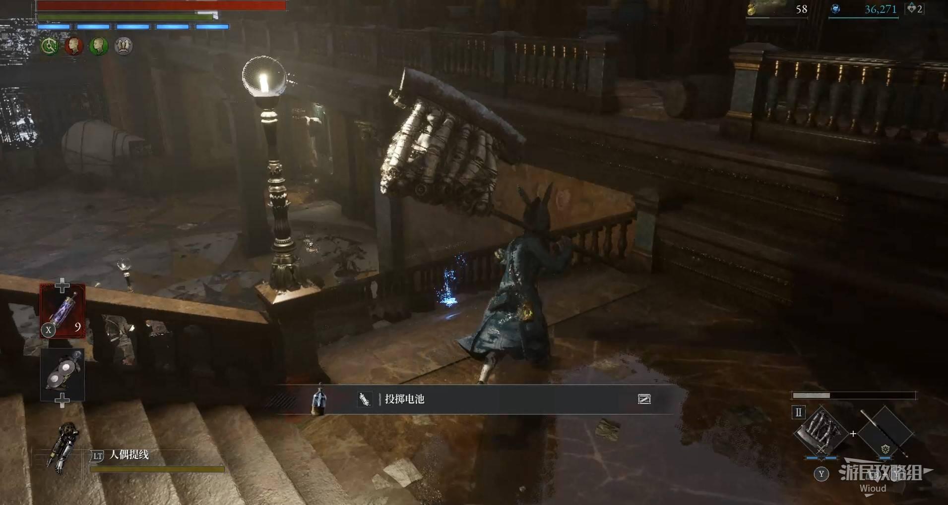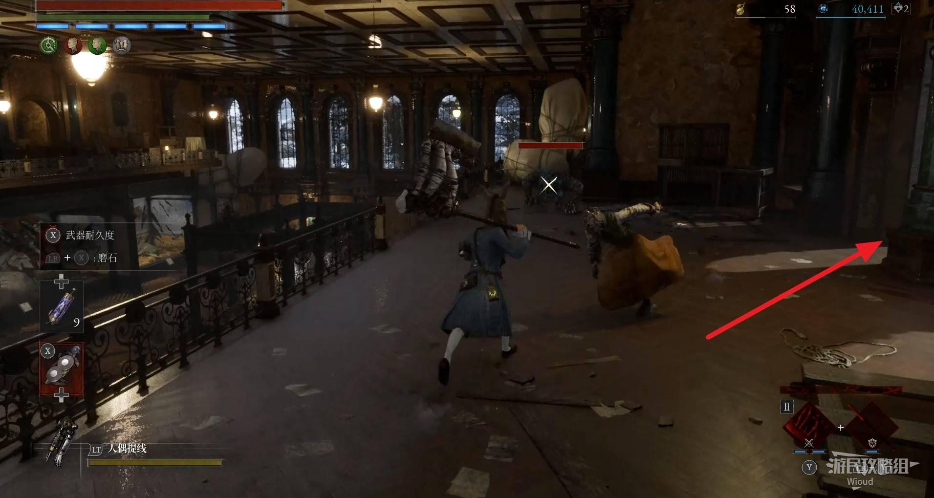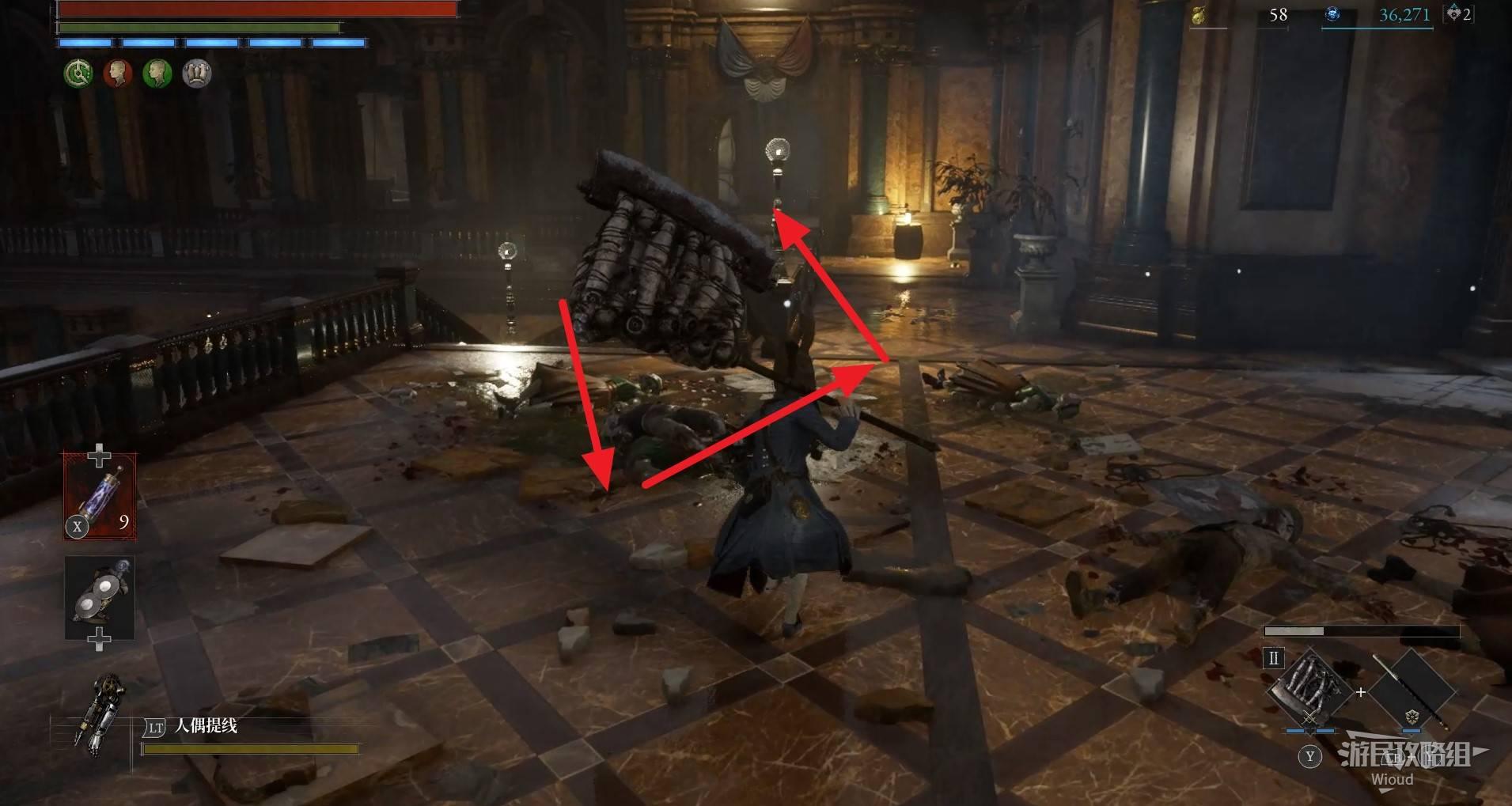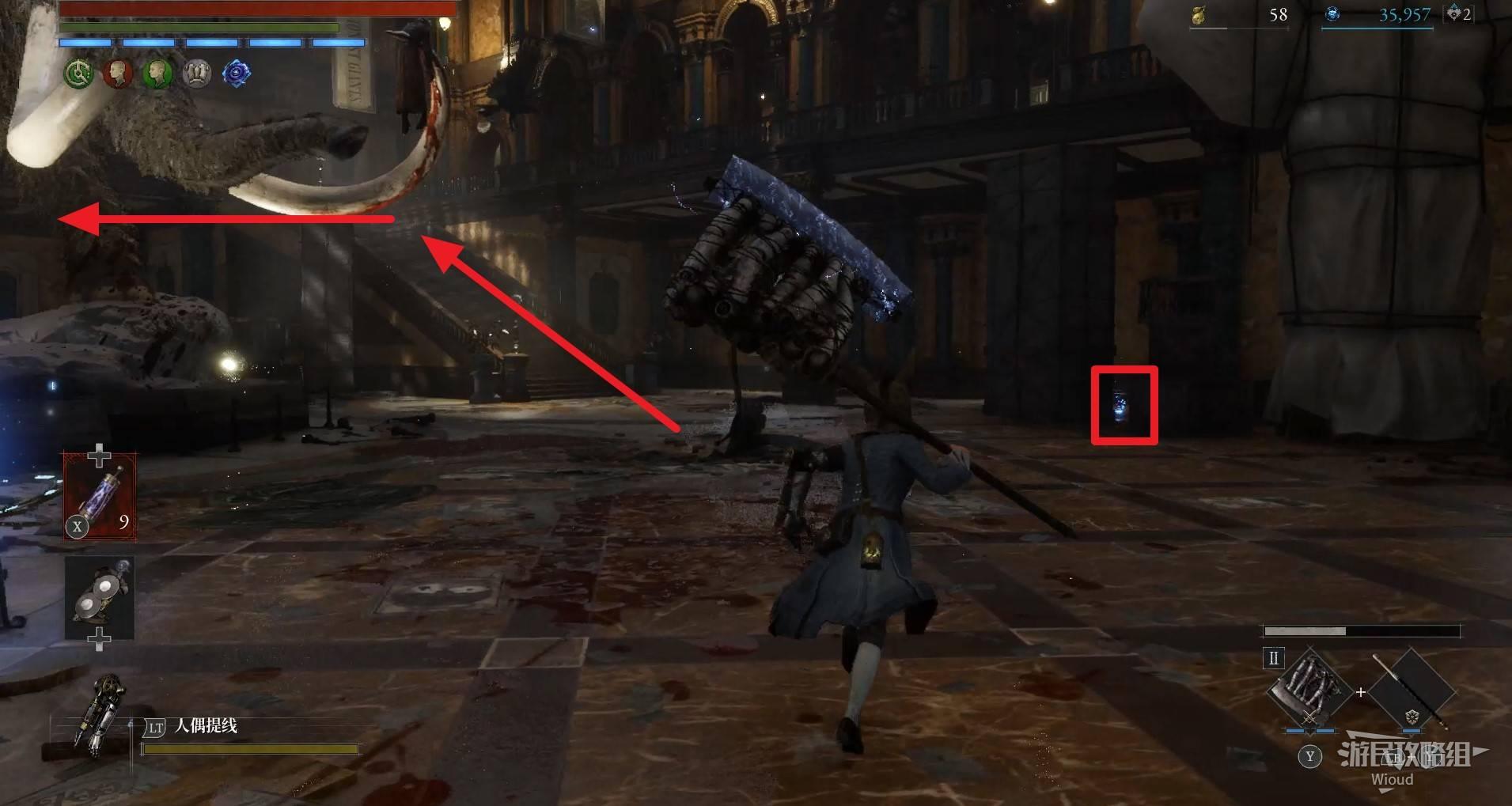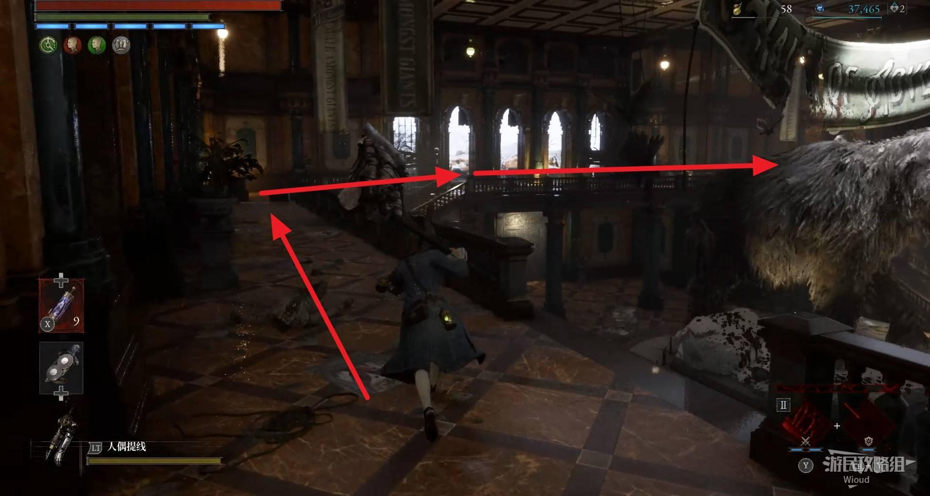 篝火右侧的箱子处可捡到【铅球】,大厅中间左侧的楼梯是断掉的。