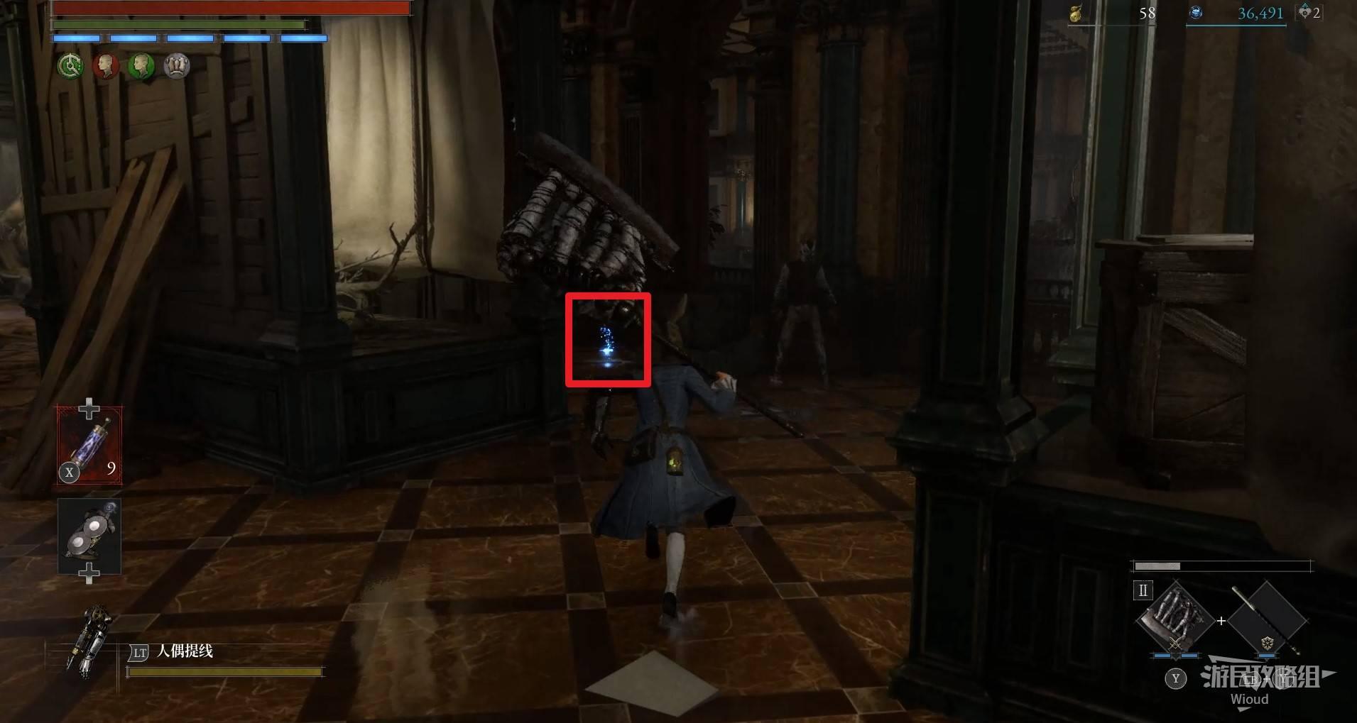 我们从右侧楼梯上2楼,走到左侧楼梯断口处,可拾取到一个【隐月月光石】。