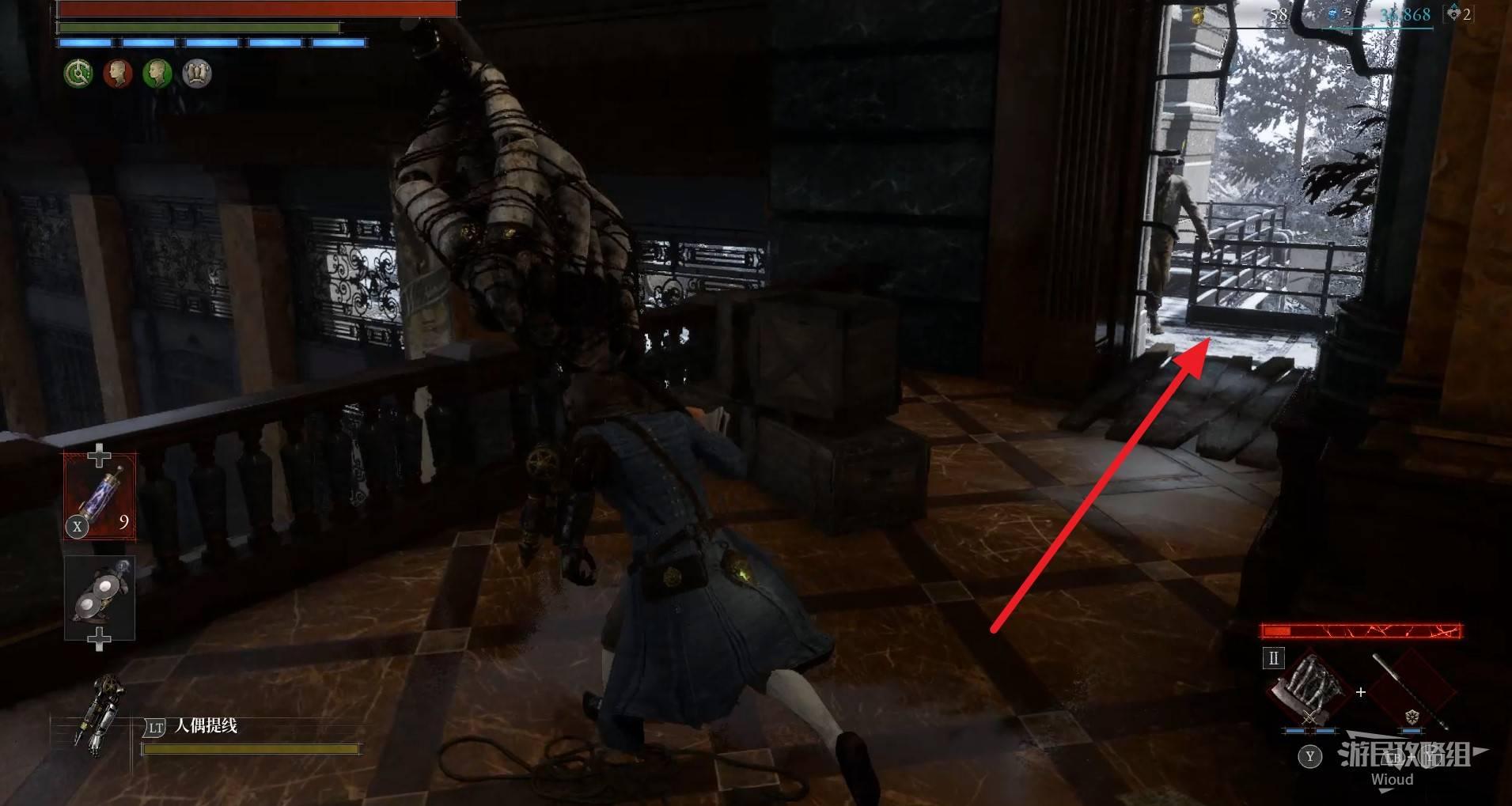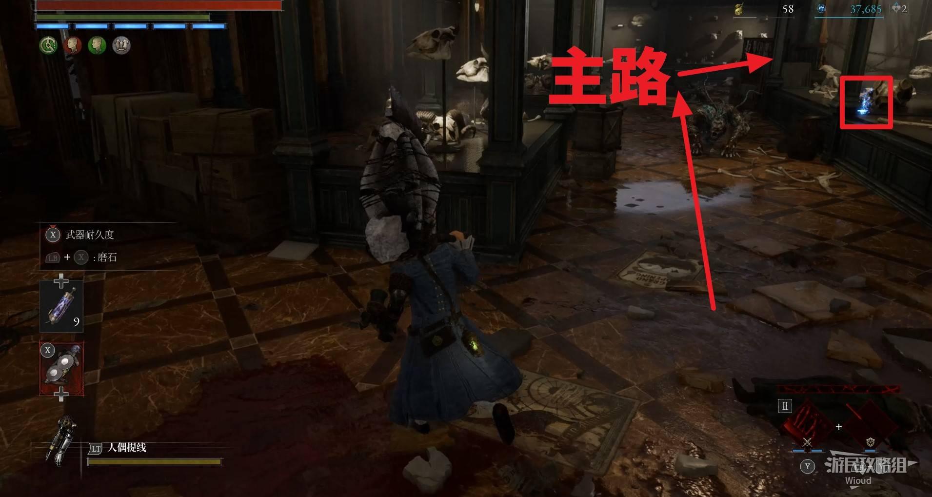 右侧有个断桥,可以看到对面有个道具点,沿路往前走,开启左侧建筑大门,此门是猛犸象标本后方锁住的大门,是个通往篝火的近路。