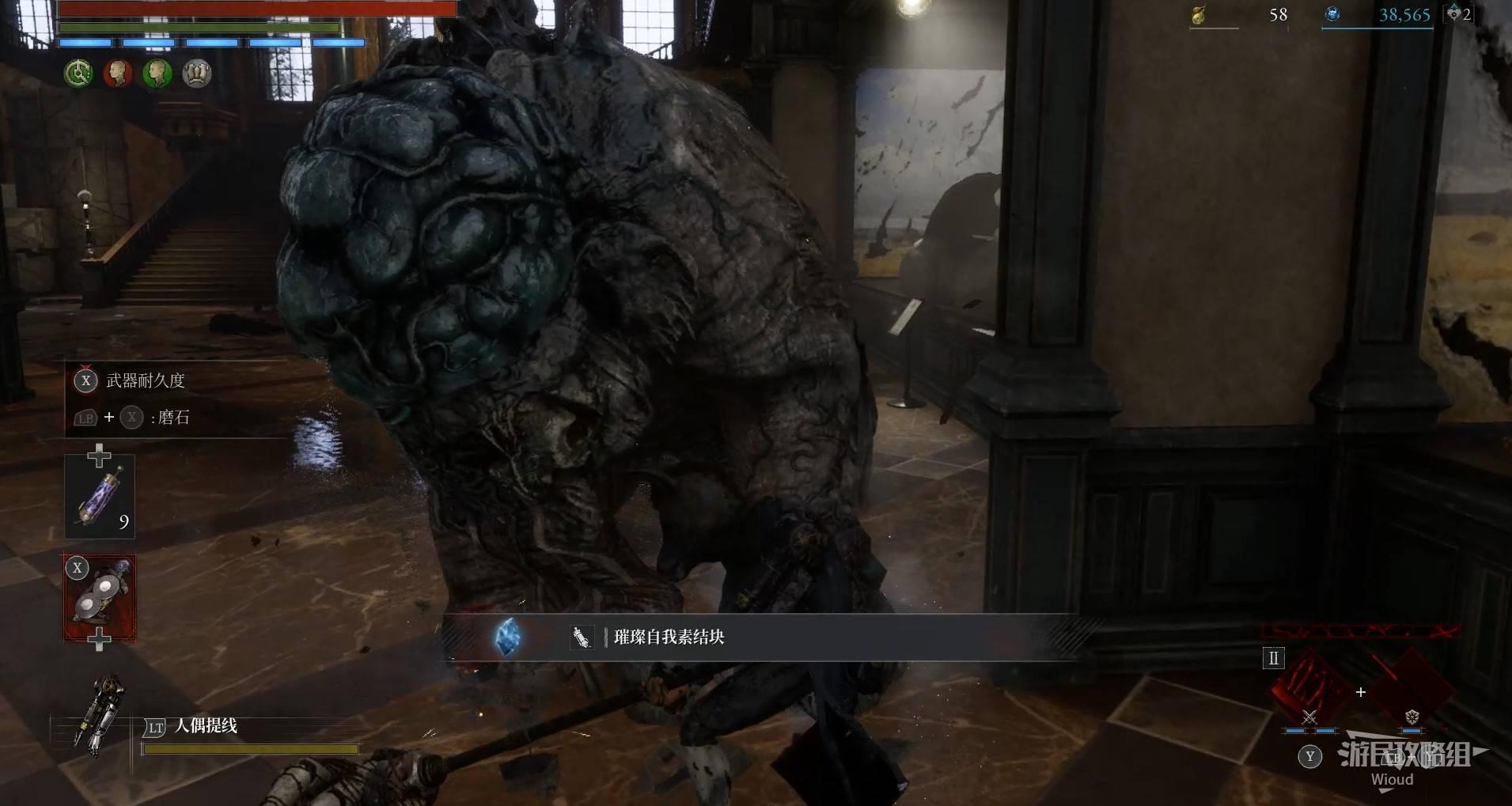因为前面的路被木箱挡住,绕到大厅右边,击败一个贼肉的大象怪可获得一个【璀璨自我素结块】。