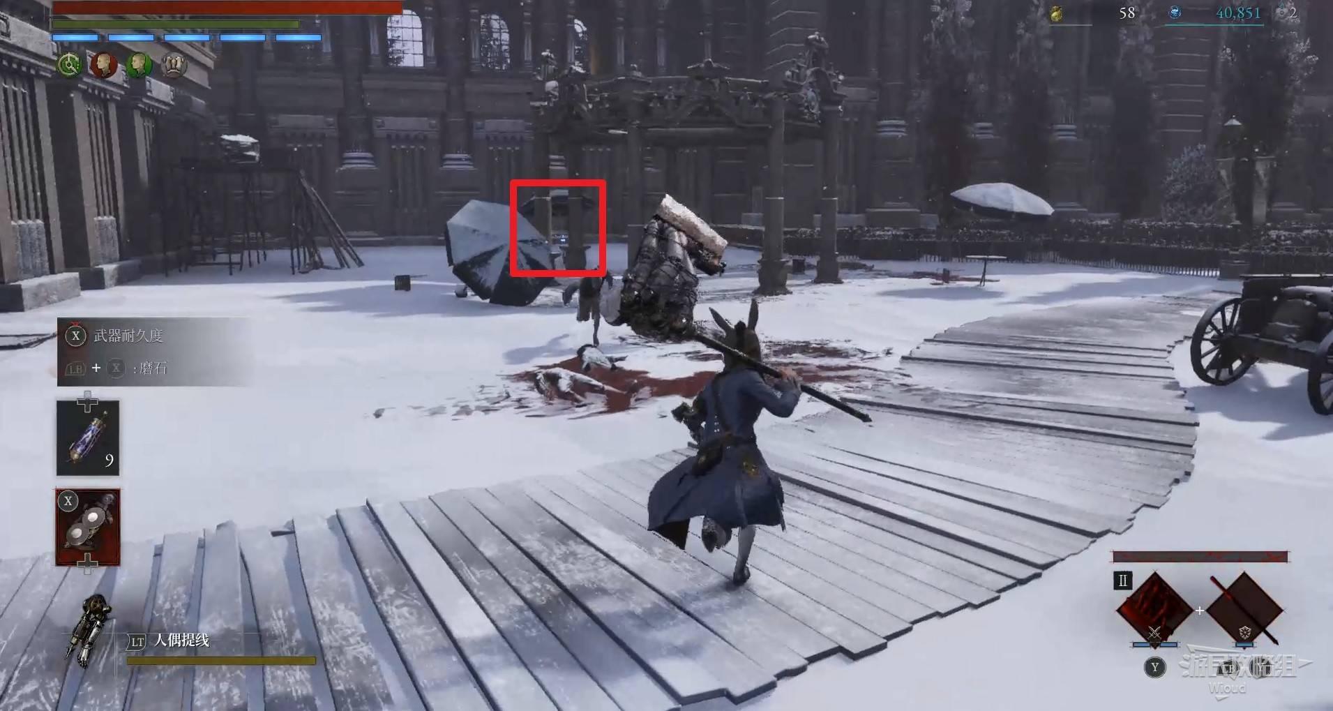 同样位置往右看,击败断桥下面的敌人,走到尽头。