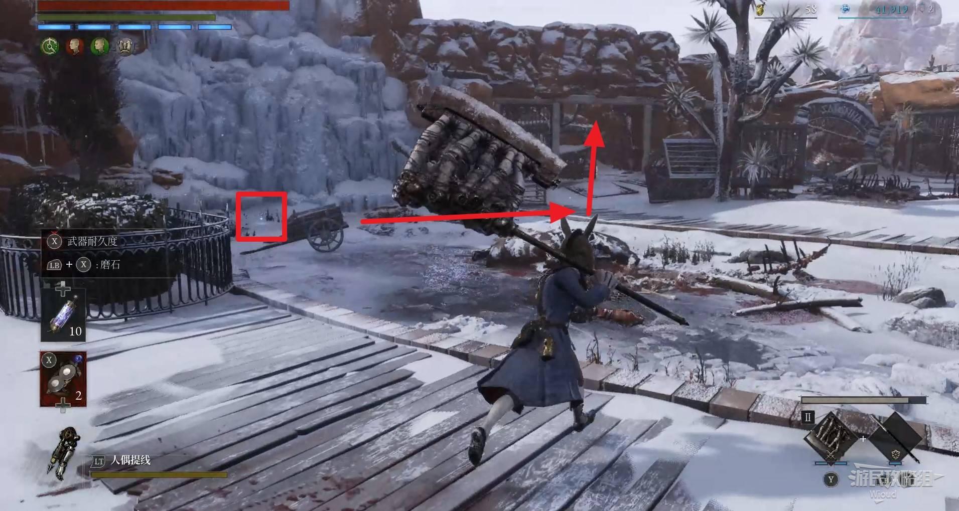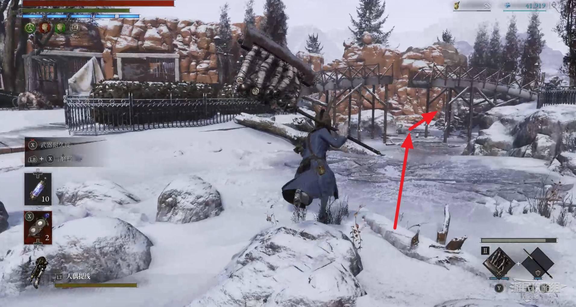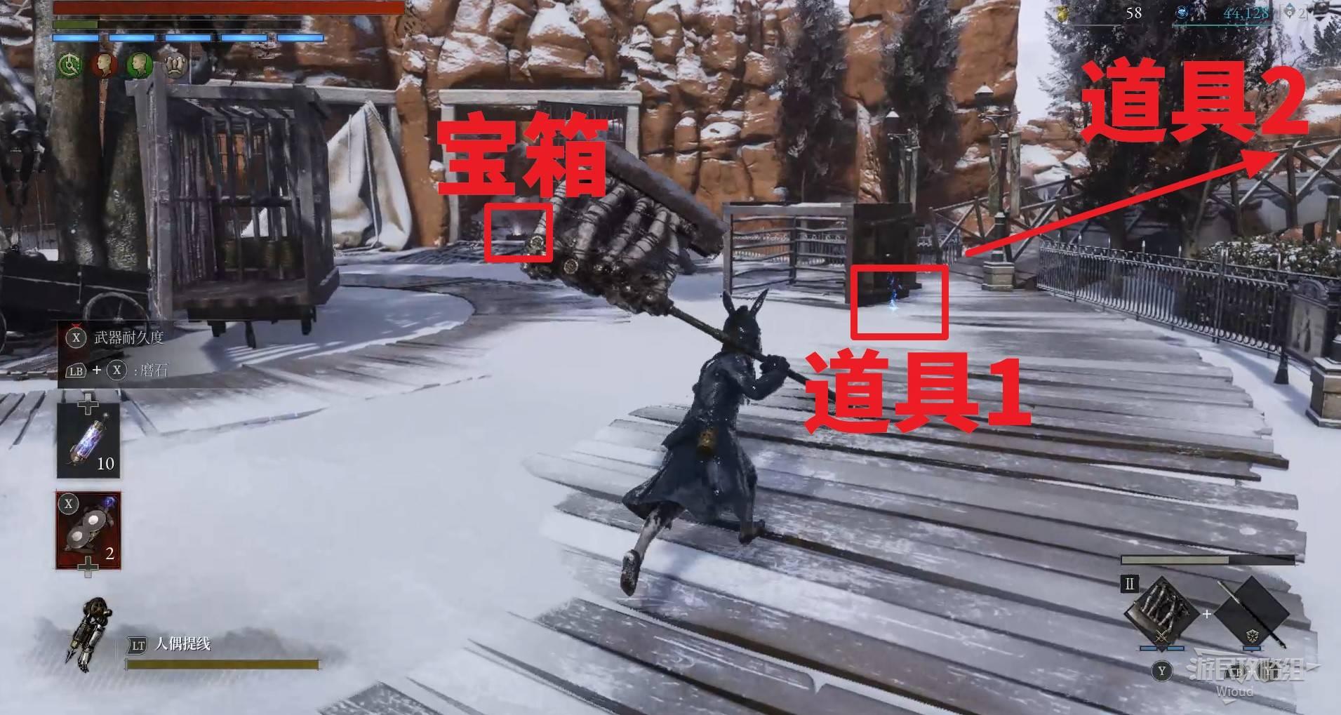 回到中间位置往前走一段朝右看,右侧木桥口有个道具可拿,沿着木桥走到断口处也有个道具可拿。