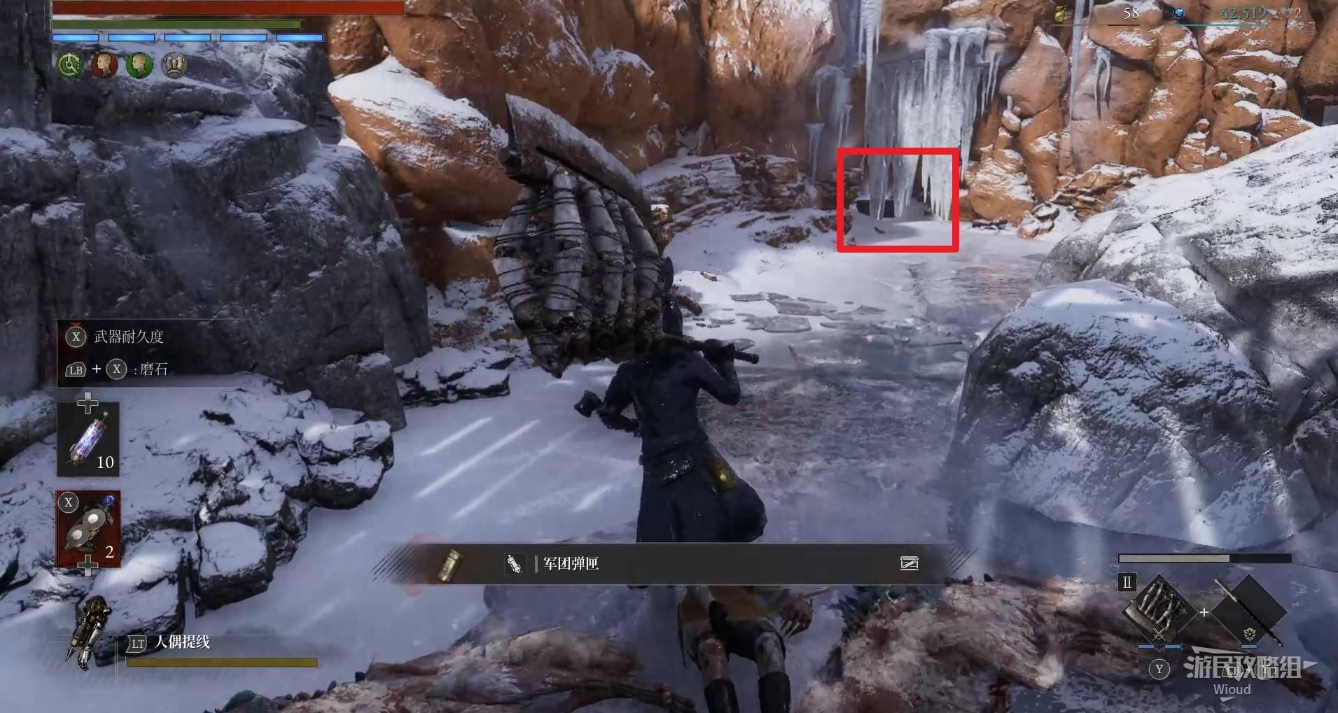 有个被冰柱挡住的宝箱,里面可捡到【军团口径】。
