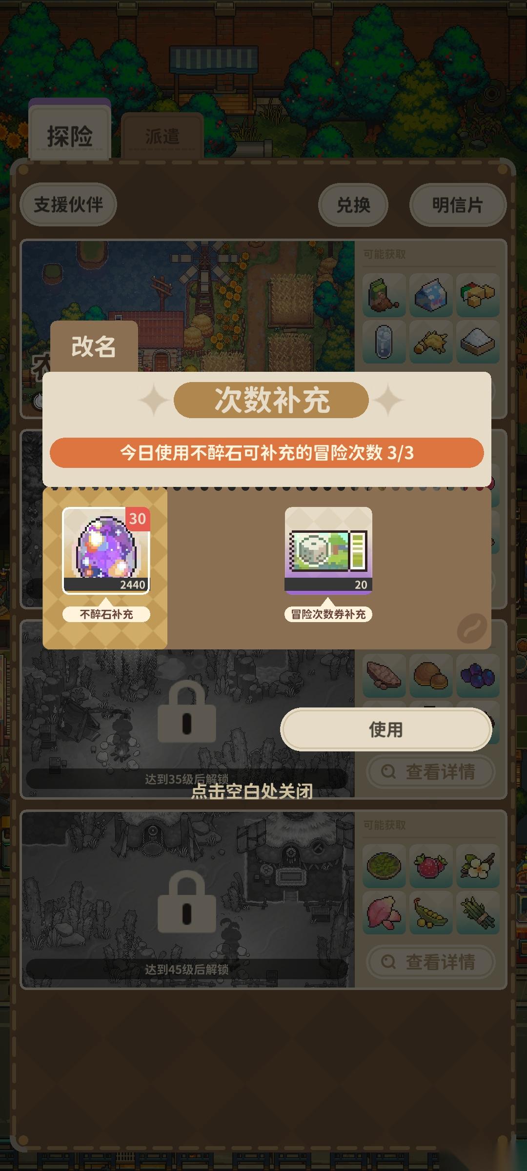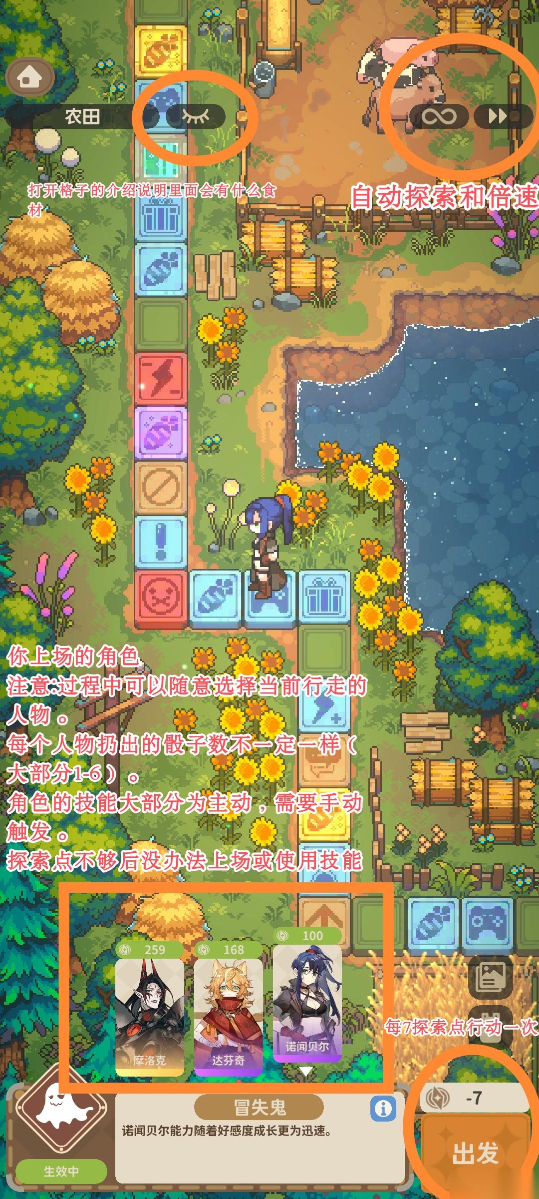 然后你可以选择你要出门探索的角色1-3个,每个伙伴的技能和探索点都不一样,探索后需要休息,休息时间视上一次探索的倍数而定。