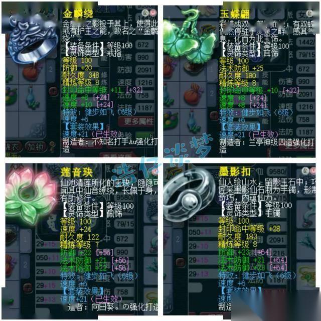 戒指和耳饰下排都是双速度一封印,配饰和手镯下排都是双法防一防御,特效都是6级健步如飞。